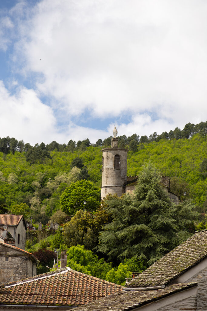 Dans le cœur ancien du village, les façades des XVIᵉ et XVIIᵉ siècles, ornées de meneaux et de bandeaux avec sculptures, révèlent l’âme du vieux Collet. Le temple protestant, remarquable par son architecture, est l’un des rares à avoir survécu aux destructions de Louis XIV. C’est ici qu’en 1702 se tint l’une des premières réunions d’insurgés camisards, faisant du Collet-de-Dèze un haut lieu de mémoire. Plus loin, les vestiges du château médiéval, le hameau ancien du Boutonnet ou encore le pont Roupt rappellent l’ancienneté du site et la puissance des crues cévenoles, ces fameuses « gardonnades » qui ont façonné ponts, berges et récits locaux. Aujourd’hui encore, le village vit au rythme du paysage cévenol : terrasses de pierres, châtaigniers, pins et eau vive racontent le lien profond entre nature et habitants.