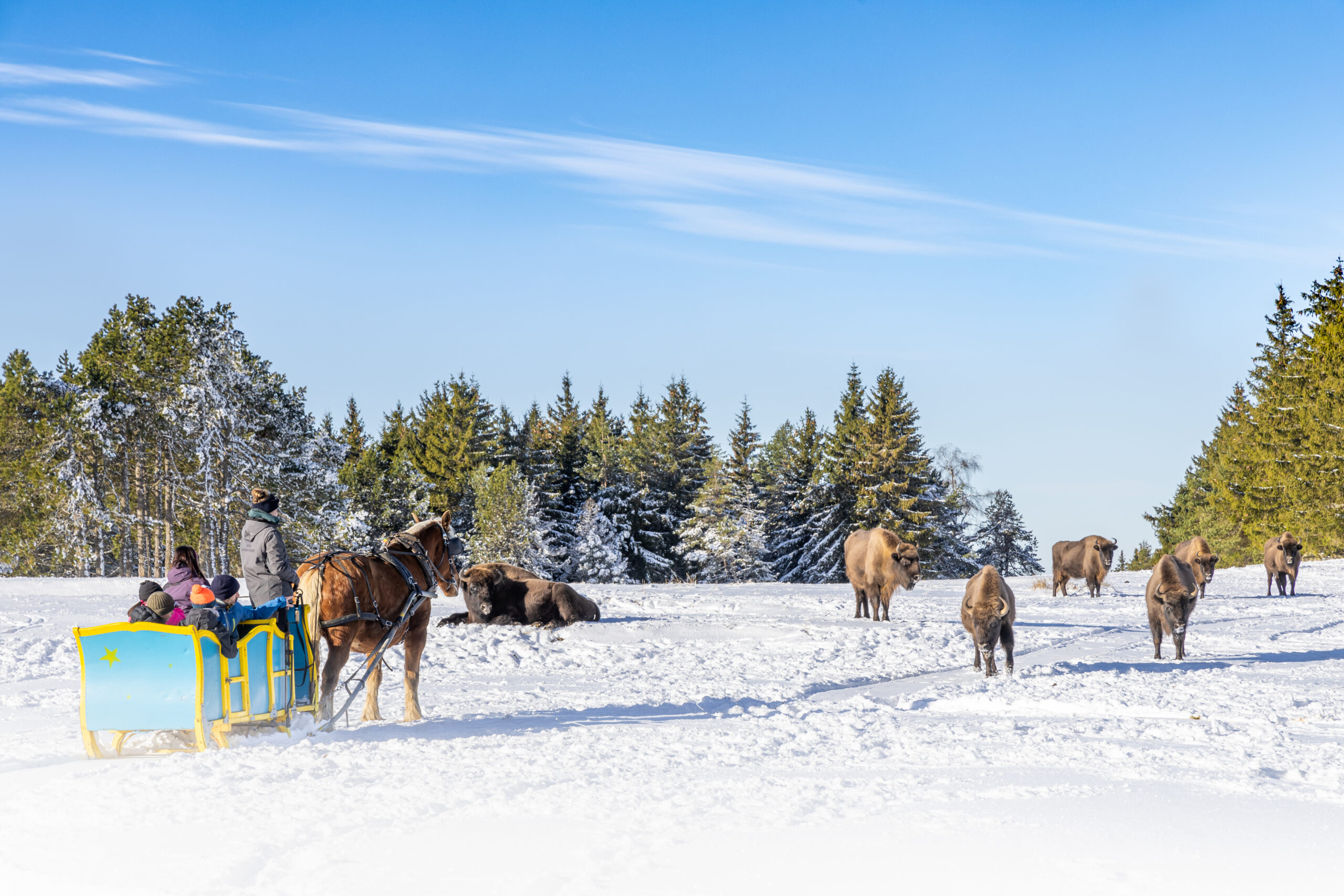 Offrez à votre famille une expérience unique au cœur des paysages enneigés de la Margeride, à la Réserve des Bisons d’Europe. Embarquez à bord d’un traîneau et glissez en silence à travers la nature sauvage pour observer ces impressionnants géants dans leur habitat naturel. Si la neige n’est pas au rendez-vous, une balade en calèche vous permettra tout de même de vivre cette aventure hors du temps.
