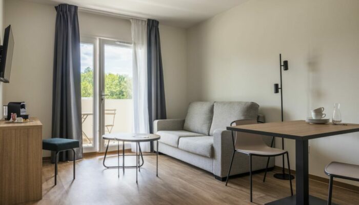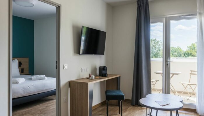 Notre établissement moderne tout confort au cœur de la nature, classé 3 étoiles propose 3 types de logements. Des chambres standards, des chambres supérieures (type T1) et des Suites (type T2). Tous nos logements sont équipés de salle de bains privative, climatisation, TV écran plat, lit double 160x200, cafetière électrique à capsules, rangements balcon ou terrasse selon disponibilité. Certains logements disposent d’un espace kitchenette et espace salon nous consulter. Nous disposons également de logements adaptés à un public PMR. Notre restaurant ouvert 7 jours/7 vous accueille pour vos repas d’affaires, loisirs ou groupes. N’hésitez pas à profiter de notre espace SPA et Détente Aquatique.